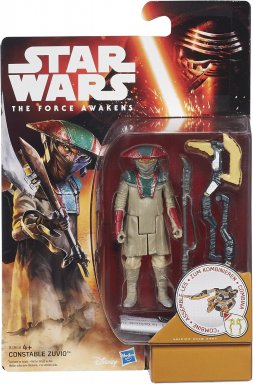 The Constable Zuvio action figure was released on September 4th, 2015 as part of the Star Wars Force Friday event. It was one of the twelve single carded figures released around the world as multiple companies launched their product lines based on The Force Awakens. This first assortment also included new character and sculpt debuts of the First Order TIE Fighter Pilot, Poe Dameron in his pilot gear, a Resistance Trooper, the villainous Kylo Ren, the First Order Flametrooper, the mysterious Captain Phasma, the fugitive Finn (Jakku), the First Order Stormtrooper, and the scavenger Rey (Starkiller Base) as well as the previously released Darth Vader and Luke Skywalker action figures. Each figure in this line included additional pieces that can be combined to build up a larger weapon.