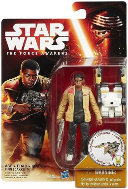 The Finn (Jakku) action figure was released on September 4th, 2015 as part of the Star Wars Force Friday event. It was one of the twelve single carded figures released around the world as multiple companies launched their product lines based on The Force Awakens. This first assortment also included new character and sculpt debuts of the First Order TIE Fighter Pilot, Poe Dameron in his pilot gear, a Resistance Trooper, the villainous Kylo Ren, the First Order Flametrooper, the mysterious Captain Phasma, the righteous Constable Zuvio, the First Order Stormtrooper, and the scavenger Rey (Starkiller Base) as well as the previously released Darth Vader and Luke Skywalker action figures. Each figure in this line included additional pieces that can be combined to build up a larger weapon.